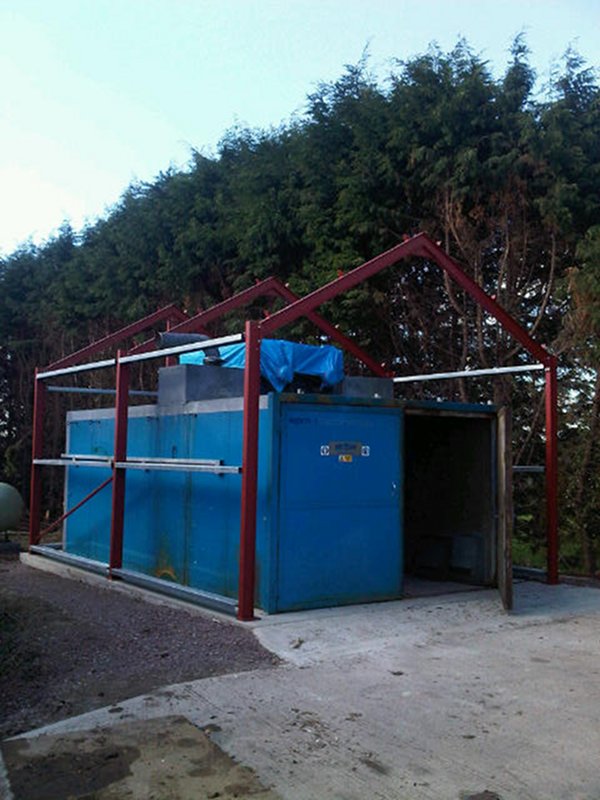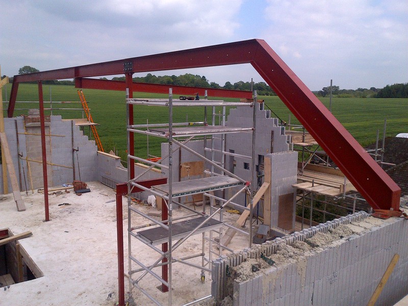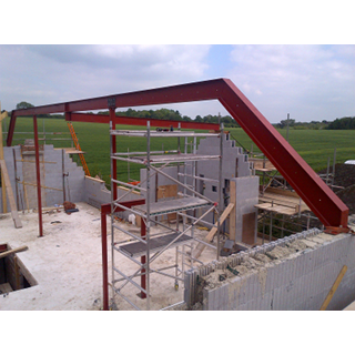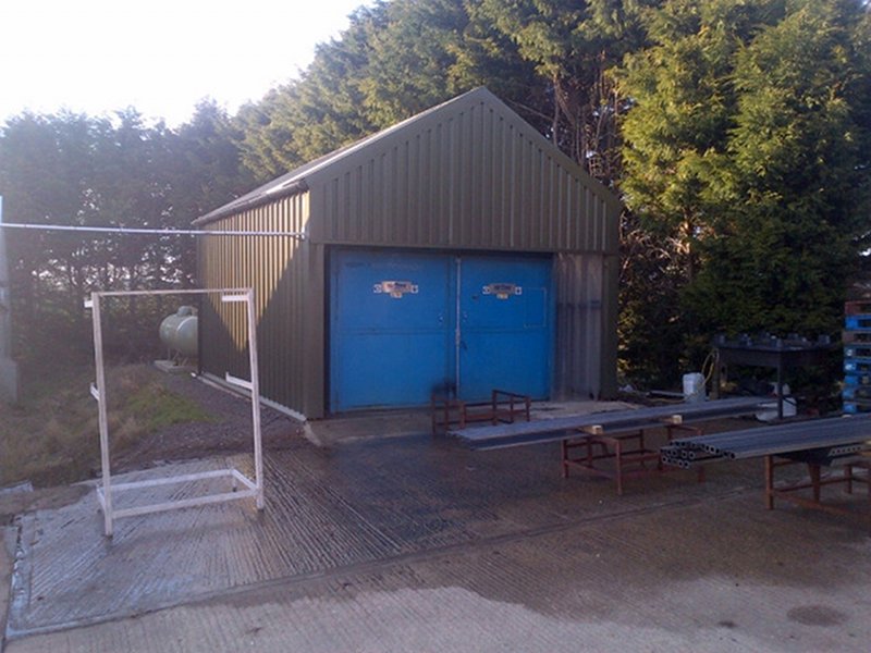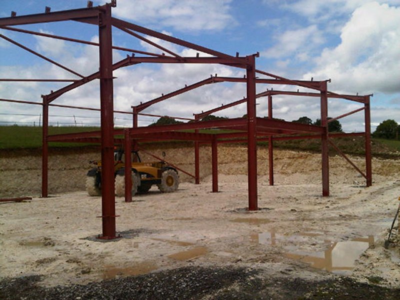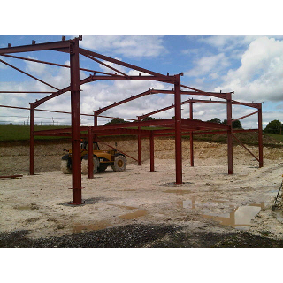 Structural steel frame for industrial unit build, with calculations and connections drawn by in-house draughtsman. Ground work preparation and metre square concrete pads with casting bolts.