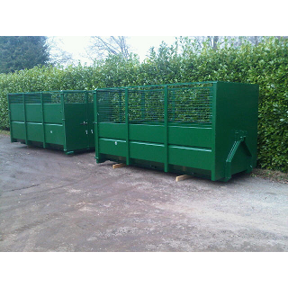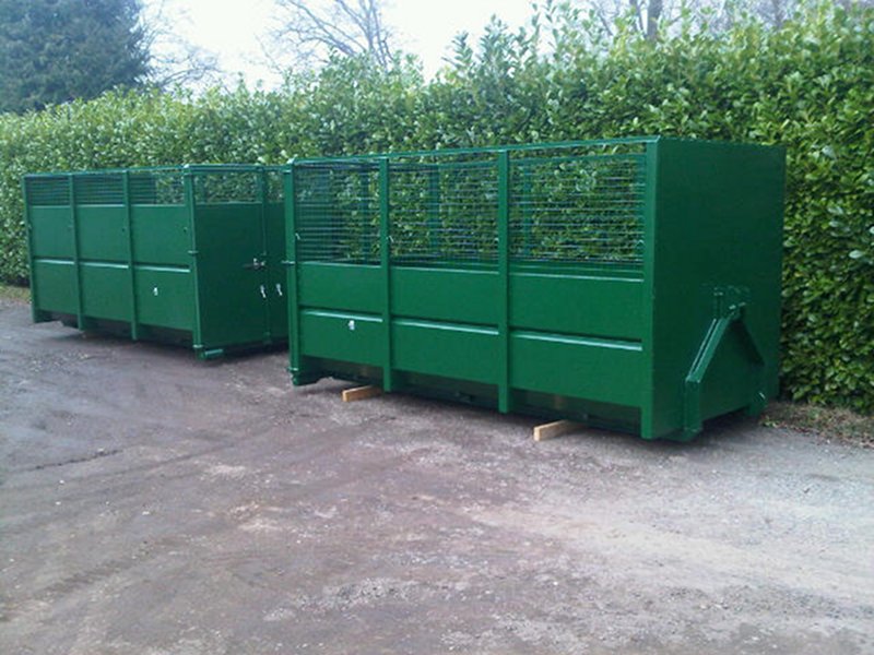 Roll on, roll off, low level waste management bins for mini hook loader vehicles.
