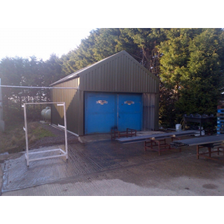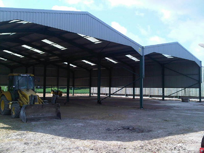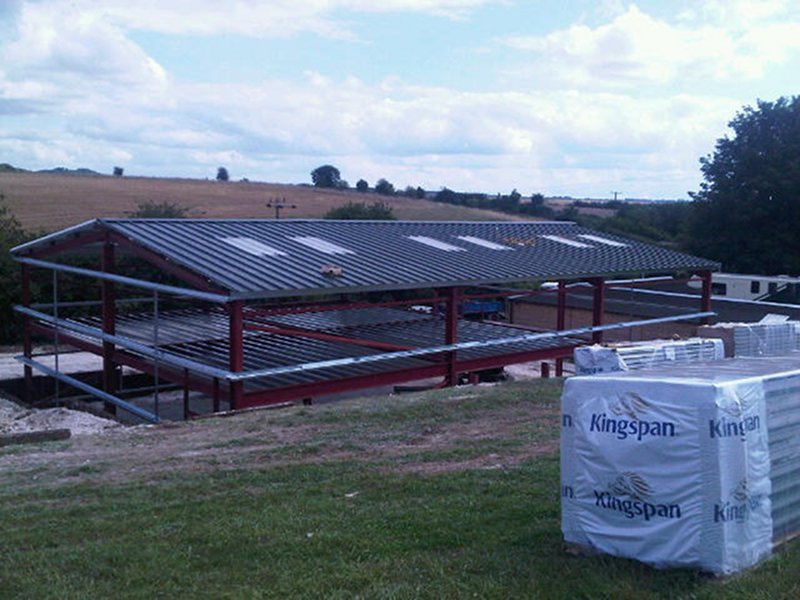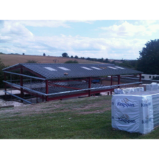 The finished structure features single skin cladding with anti-condensation roof panels, ridge cap, barge ends and guttering.