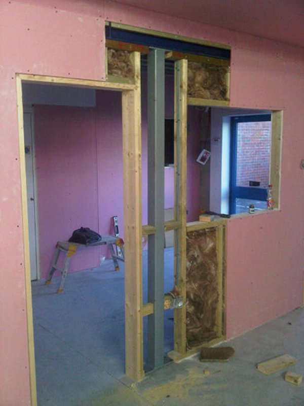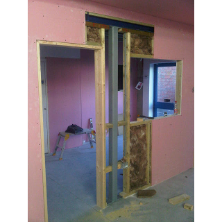 Studwork partitioning integrated with steel framework, compliant to fire rating regulations.