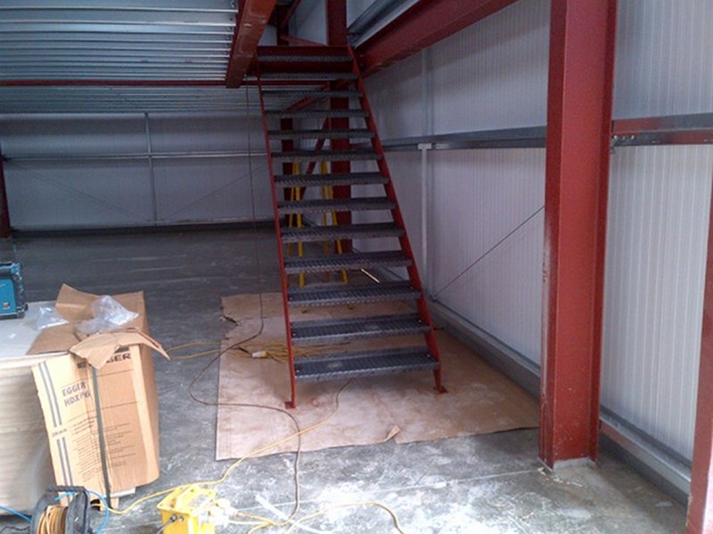 Industrial storage facility complete with load-bearing mezzanine floor. Composite panelling with 10% rooflights on 10 degree roof pitch.